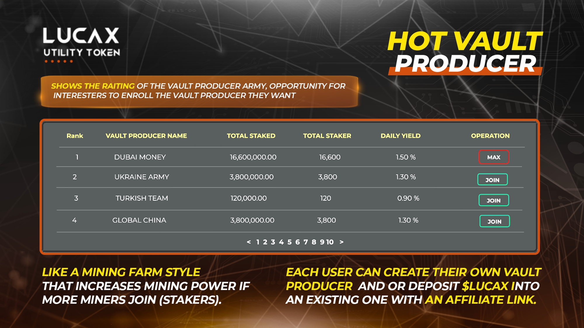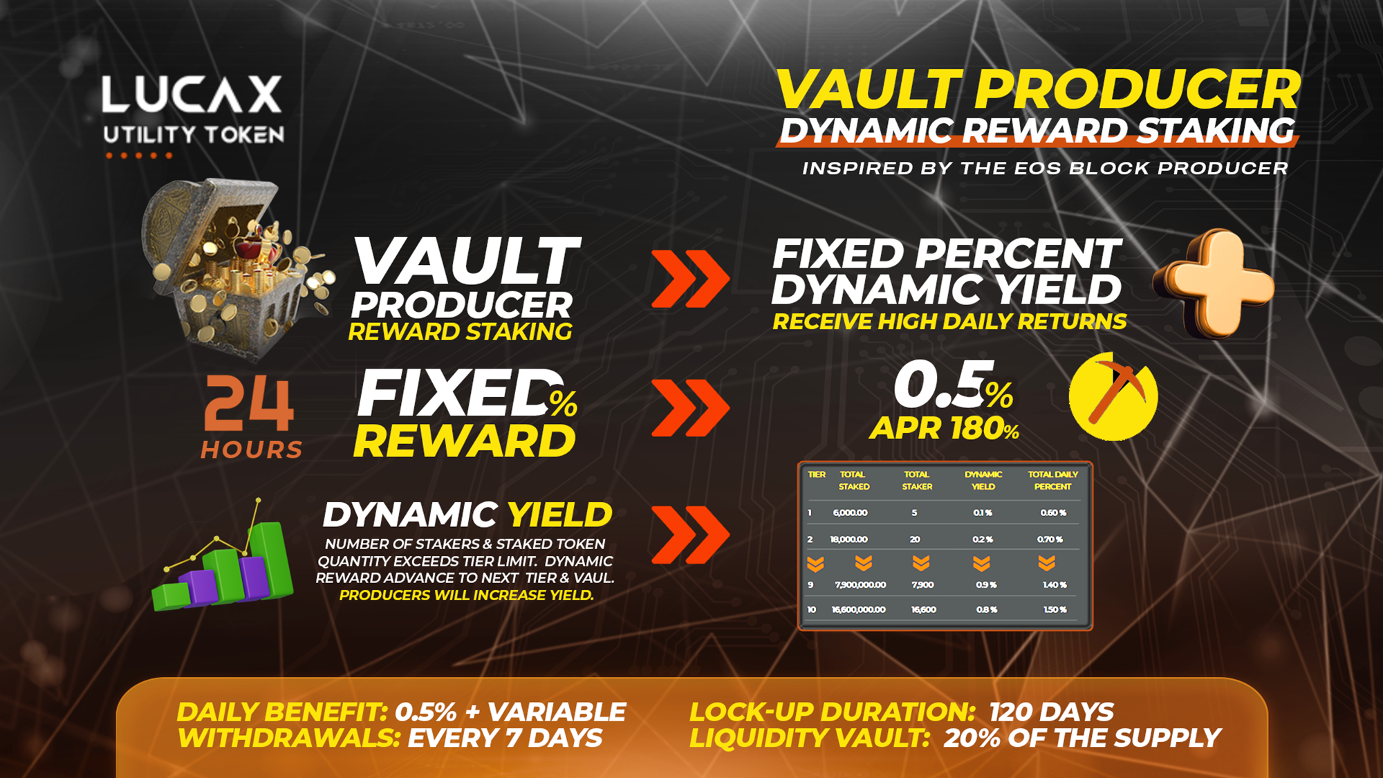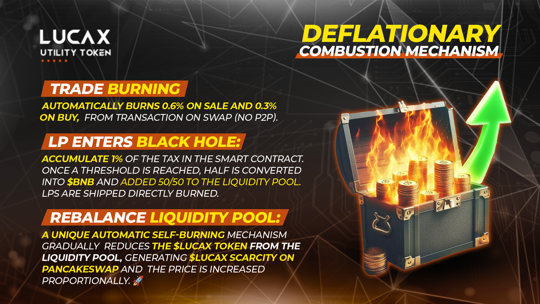 **$LUCAX** was designed with the **promise of long-term stability**, combining its hyper-growth nature with utility and a deflationary mechanism that fosters aggressive and consistent price appreciation.
